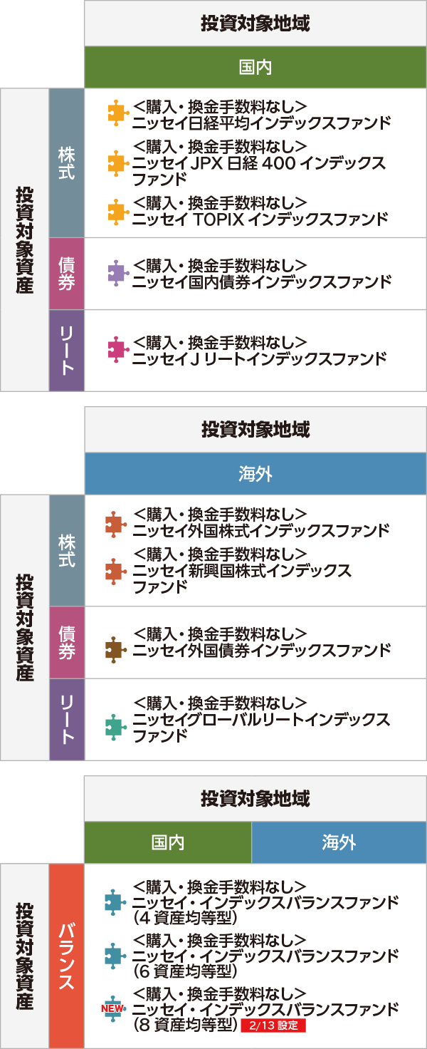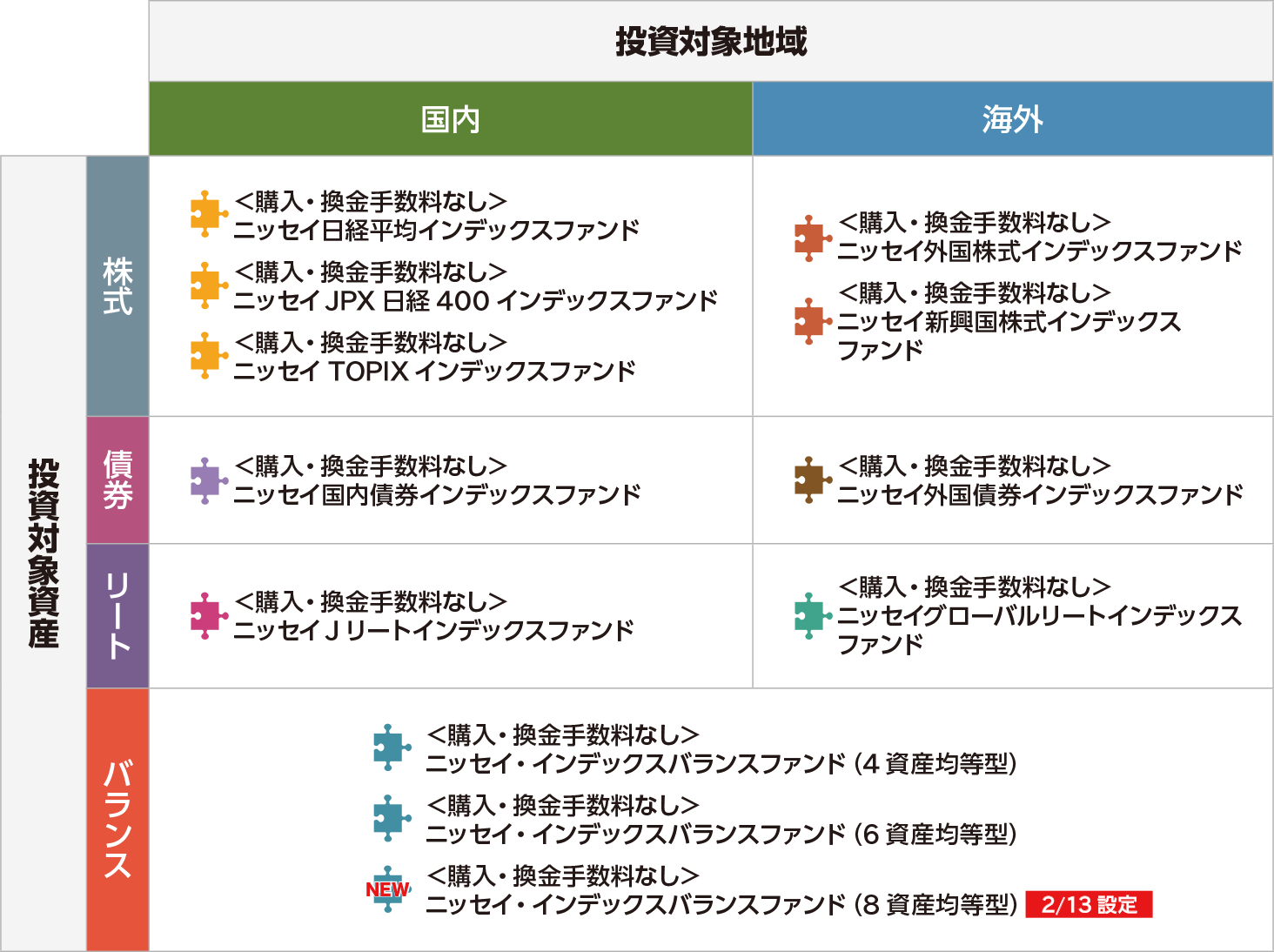 国内・海外の株式・債券・リートに投資するインデックスファンドを、全12種類ご用意しています。