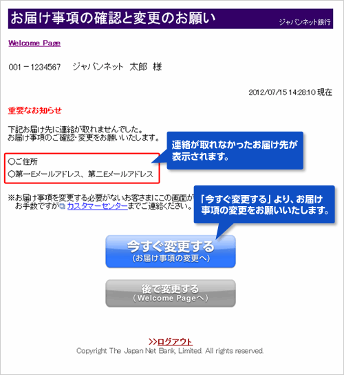 2012年7月より、当社からの郵便物やメールがお届けできなかったお客さまには、お取引画面にログインした際に、お届け事項の確認と変更をお願いする画面が表示されます。