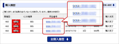 (1)ジャパンネット銀行ホームページへログイン後、「BIG・toto」>「JNB-totoくじ購入・履歴確認」>「全購入履歴」よりくじの照会番号をご確認ください。