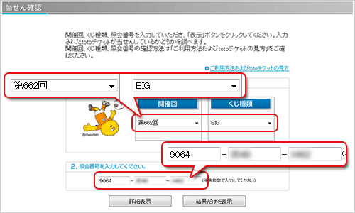(2)totoオフィシャルサイトで、「当せん確認」ボタンをクリック後、開催回、くじ種、照会番号を入力のうえ、結果をご確認ください。